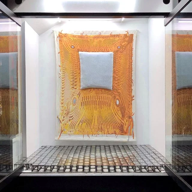 In the conduits and pathways in Kang’s bricks and woven imagery, there is a handmade quality that makes the digital world feel familiar. Warped, wobbly lines, reminiscent of solder that has crept out beyond the maker’s tool, create simple shapes. The playful nature of these forms lends familiarity to a silicon world that we often consider to be sterile and cold. There is a sense of magnification, and of getting a peek “under the hood” at the miniature valves through which complex operations flow. The warmth of the wool and the outline brick edges reinforces this sense of physicality, making us feel as though these technologies are things that we can actually reach out and touch, even as electricity loops through them.